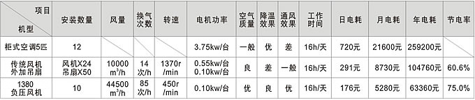 1000m2廠房三類通風(fēng)、降溫設(shè)備運(yùn)營(yíng)對(duì)比表