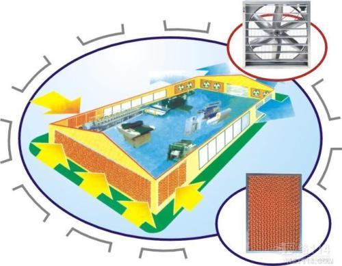 2.降溫水簾系統(tǒng),對車間外空氣二次制冷進入車間降溫。車間安裝負壓風機的對面或者側面墻壁的窗戶上安裝降溫水簾系統(tǒng),把進入車間內(nèi)的補充空氣經(jīng)過降溫水簾二次降溫,變成溫度更低的空氣被負壓風機強行引入到車間內(nèi)降溫,此方法與負壓風機配合使用降溫,需要注意的是水簾降溫系統(tǒng)空氣的量和速度要足夠補充車間內(nèi)高溫悶熱空氣排出的量和速度,而且要做好車間的密封,盡量保證進入車間的空氣經(jīng)過降溫水簾系統(tǒng)。